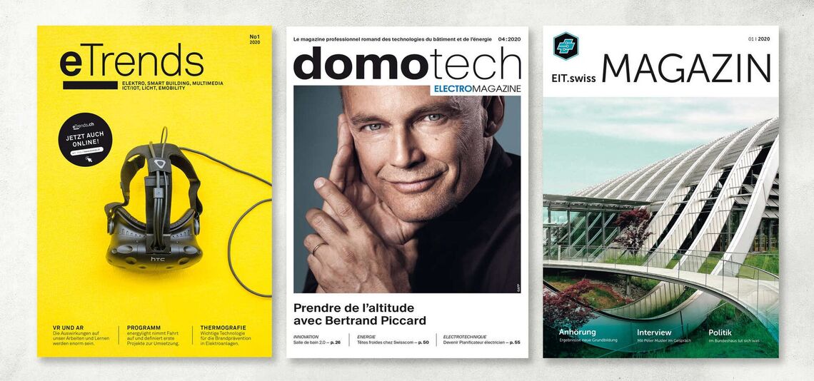 Das EIT.swiss MAGAZIN stellt den Mitgliedernutzen in den Fokus. Die Reportagen fallen mit einer hochwertigen Bildsprache auf, und die exklusiven Artikel mit Succes Stories zeigen die vielfältigen Tätigkeiten der Branche, des Verbandes und der Mitglieder. Das EIT.swiss MAGAZIN bündelt auch die Kernbotschaften des Verbandes zu Themen wie Arbeitsrecht, Arbeitssicherheit und Gesundheitsschutz, Verbandsprojekten sowie zu Angeboten und Seminaren. Dank den Fachtiteln der Medienart wird die Elektro- und Gebäudetechnikbranche weiterhin umfassend und fachkompetent über Trends, Branchenentwicklungen und neue Technologien informiert. Zum Konzept gehören auch regelmässige Newslettermailings sowie Posts auf Linkedin und den Webseiten eitswiss.ch und etrends.ch.