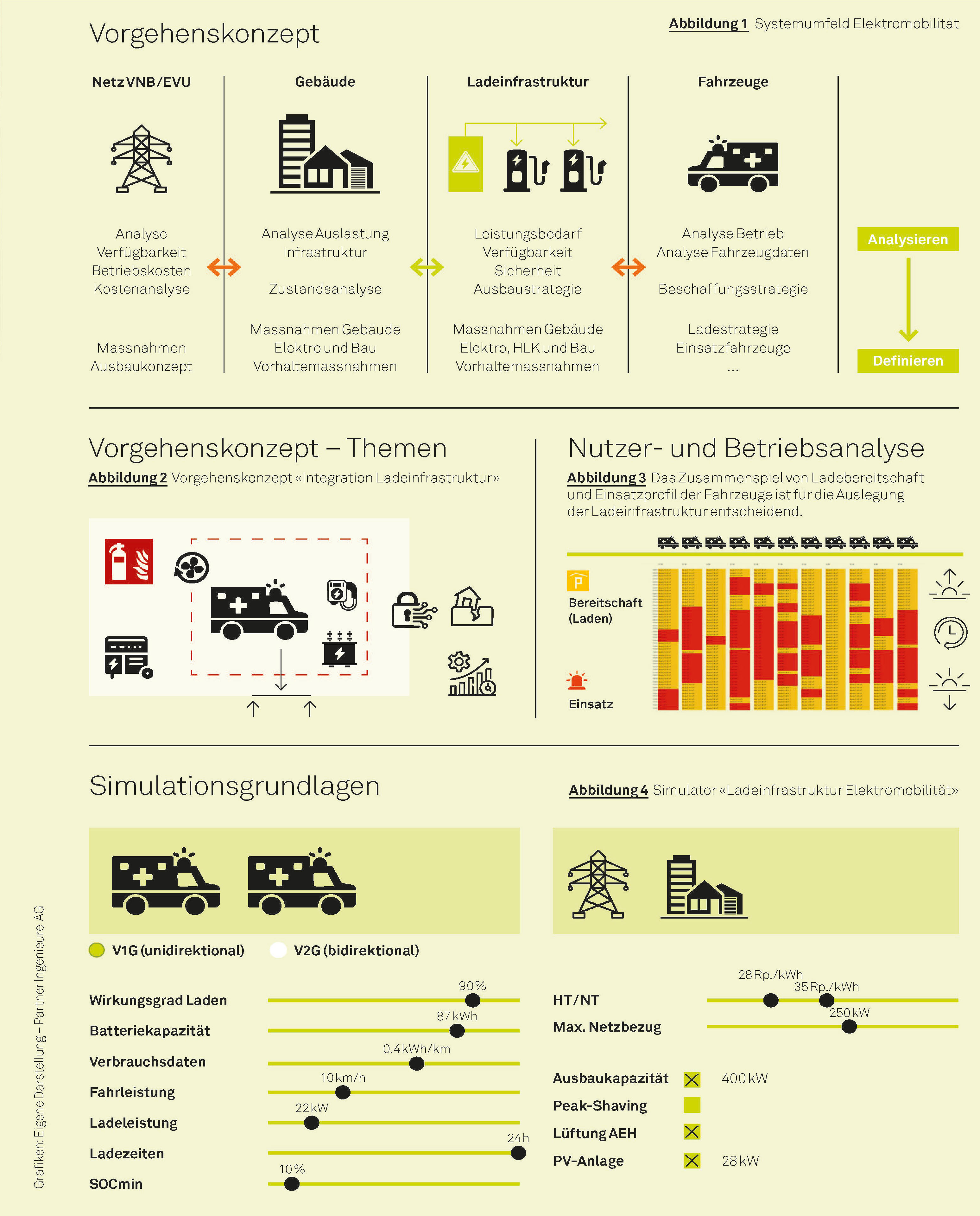Die Elektrifizierung einer Fahrzeugflotte erfordert ein systematisches und mehrstufiges Vorgehen. Im Mittelpunkt steht die Analyse der Nutzer- und Betriebsanforderungen, die Auskunft darüber gibt, wie viele Fahrzeuge im Endausbau vorgesehen sind, welche Fahrprofile existieren und welche Ladezeiten im Betrieb realistisch möglich bzw. nötig sind, um die Betriebsbereitschaft sicherzustellen. Das Beispiel der Sanität des Kantons Basel-Stadt zeigt, wie technische, bauliche und betriebliche Aspekte ineinandergreifen müssen, um die Einsatzfähigkeit der Fahrzeuge zu gewährleisten.