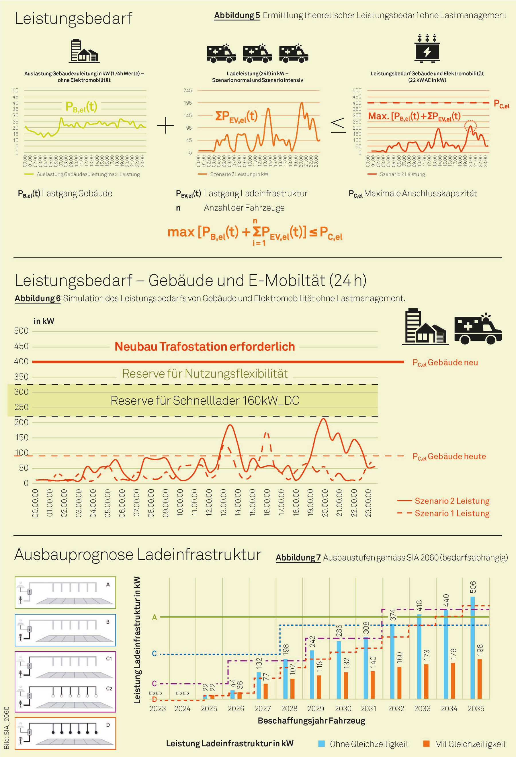 Die Ausbauprognose verdeutlicht die Notwendigkeit einer skalierbaren Lösung. Ziel ist es, eine Ladeinfrastruktur zu entwickeln, die den vollständigen Ausbau für etwa 30 Einsatzfahrzeuge ermöglicht und darüber hinaus ausreichende Kapazitätsreserven für flexible Nutzungsszenarien sowie Optionen zur Schnellladung bereitstellt. Die Prognose bezieht verschiedene Ausbaustufen (A–D) nach SIA 2060 mit jeweils steigender Ladeleistung ein und beschreibt den Übergang vom Grundausbau hin zu einer vollumfänglichen Ladeumgebung mit hoher Leistungsdichte.