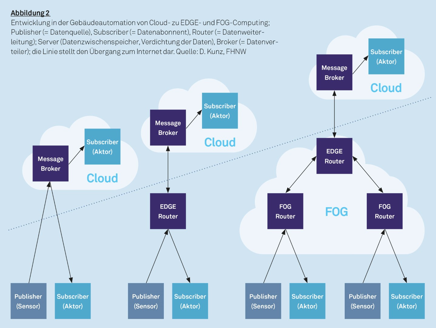- FOG-Computing: Die lokale Intelligenz wird nochmals gestärkt; alles, was lokal entschieden werden kann, bleibt lokal und macht keinen Umweg über das Internet; die Automationshierarchie wird wie bei der traditionellen Gebäudeautomation lokal erstellt, das System wird schneller, zuverlässiger und stabiler; über den FOG-Servern folgt typischerweise ein EDGE-Router.
