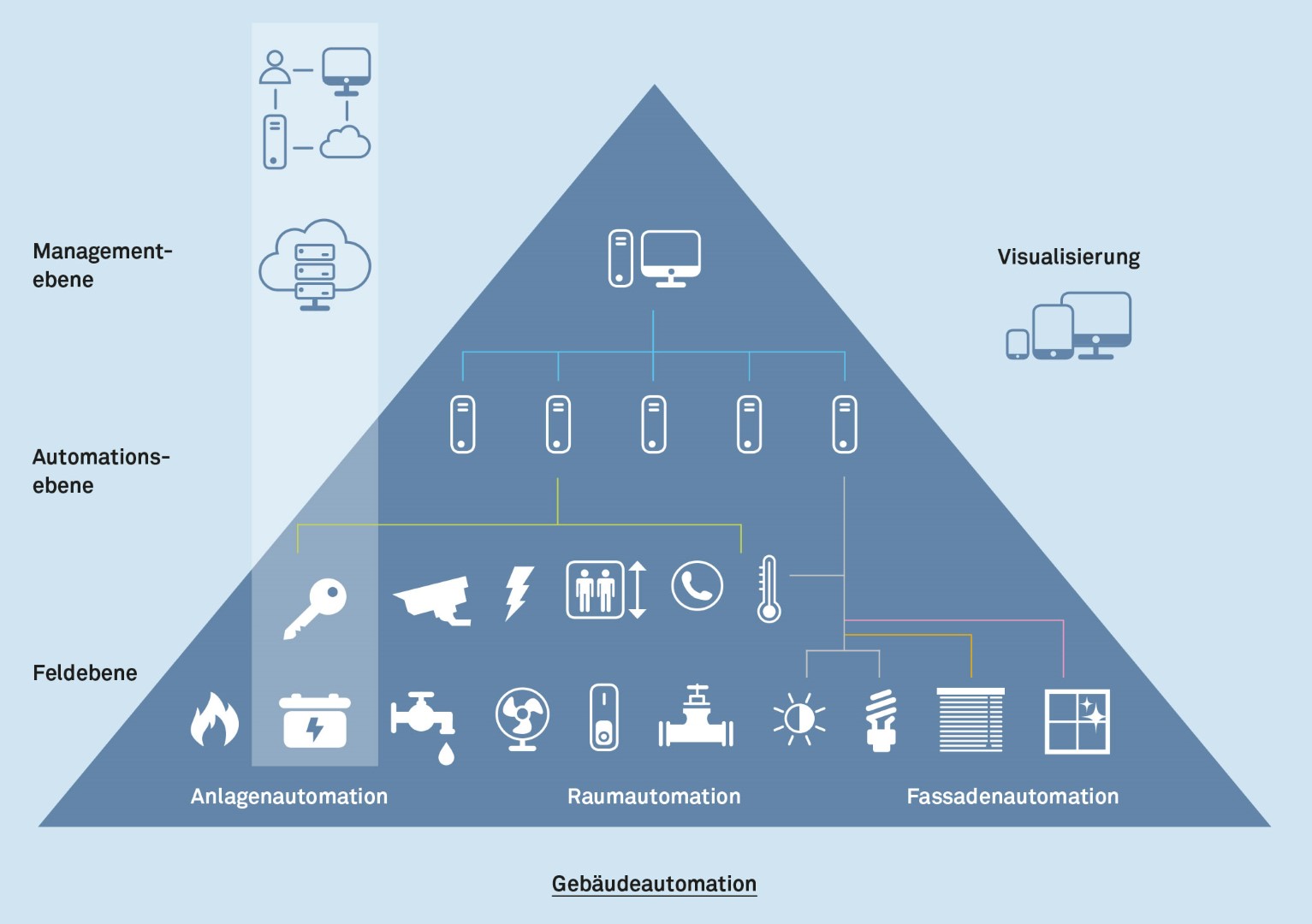 Die EN 16484 beschreibt die traditionellen Gebäudeautomationssysteme (Abb. 1). Sie sind hierarchisch in die Ebenen Feld, Automation und Management gegliedert, und die «Intelligenz» nimmt von unten nach oben zu. Traditionell gilt dies jeweils separat für jedes Gewerk wie Heizung, Kühlung, Beleuchtung und Verschattung. Dieser Aufbau ist mit Blick auf die historische Entwicklung der Computertechnik verständlich, weil grosse Rechenleistung teuer, energieintensiv und schwer war.