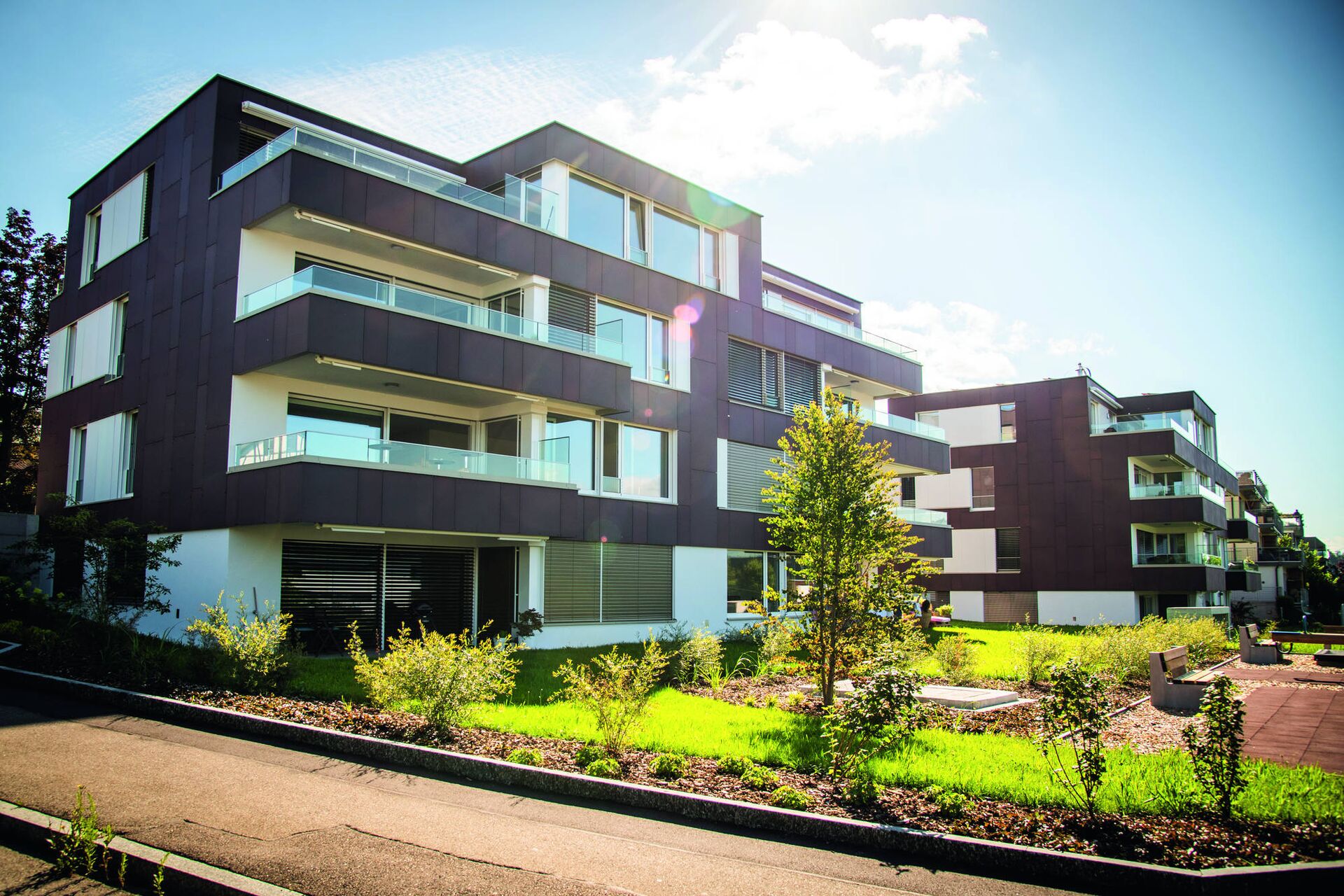 Foto: Die Wohnüberbauung in Männedorf versorgt sich selbst mit Energie. Dafür sind auch die Fassaden mit Solarpanels bedeckt, was kaum auffällt.