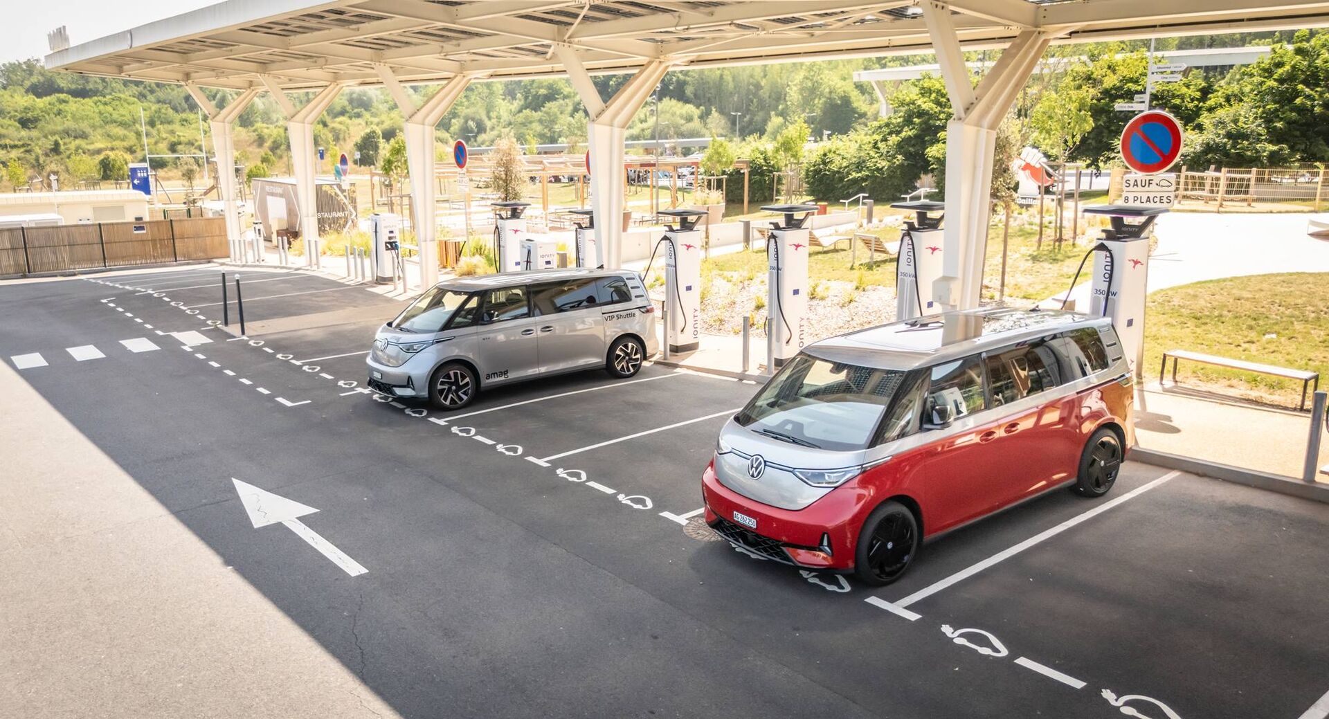 Und das Beste: Die Station ist ein echtes Vorzeigeprojekt. Überdachte Ladeplätze mit Solarpanels, sehr saubere Anlagen, sogar ein Windschutzscheiben-Reinigungsset. Hier ist man bereit – für die Zukunft, oder besser: für die Gegenwart.