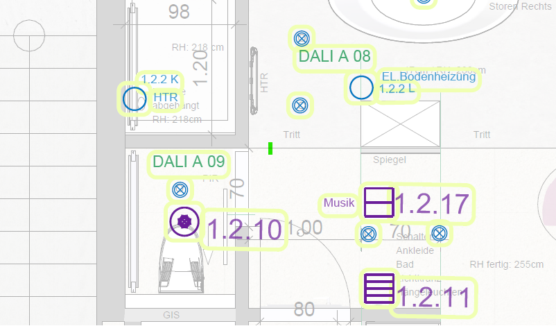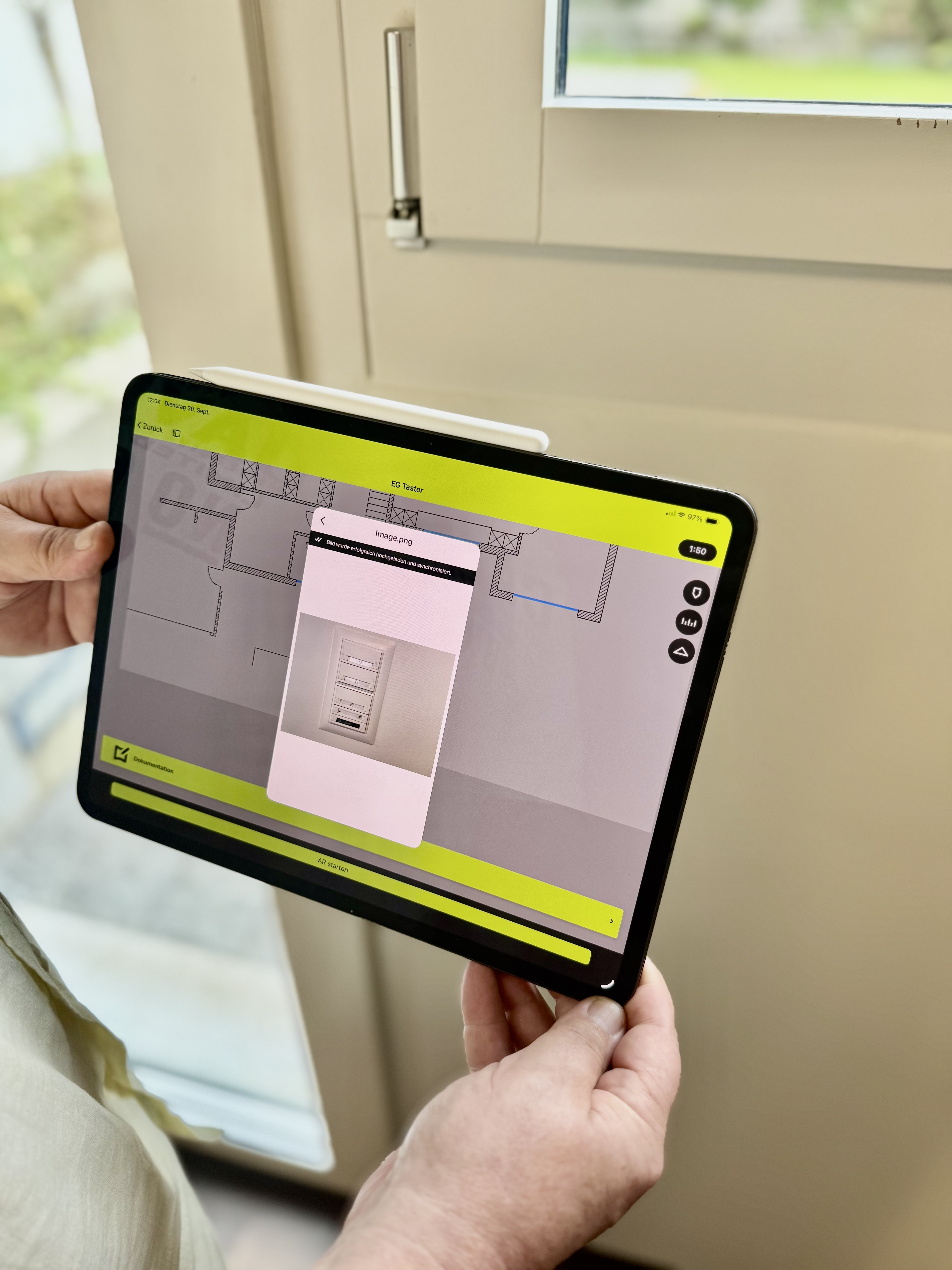 Alle Schalter, KNX-Komponenten und Tableau-Elemente werden direkt im digitalen Grundriss fotografiert direkt mit Marker im digitalen Grundriss positioniert.
