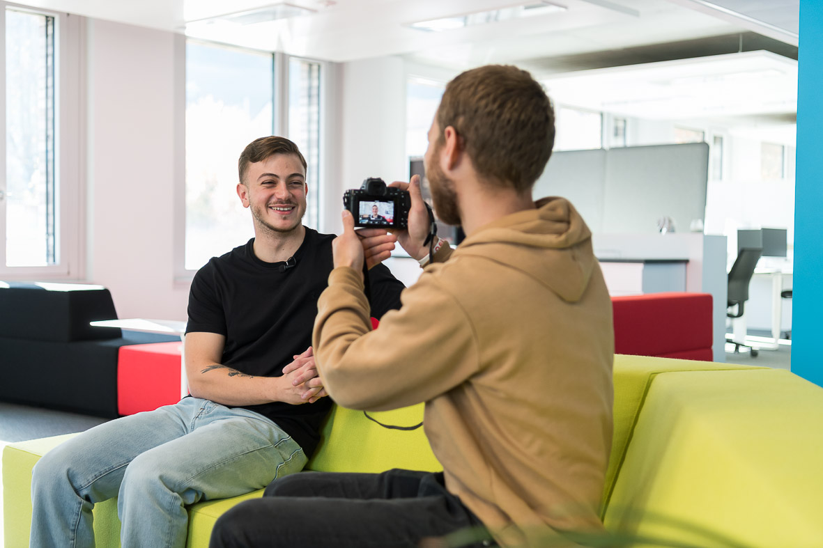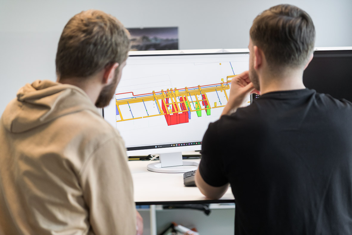 Arbeitsumfeld. Hier arbeiten Fachleute in komplexen Projekten und helfen Jungen, sich erfolgreich in die Materie einzuarbeiten. Auf seinen zwei Bildschirmen zeigt Caner Julian ein komplexes 3D-Modell eines Neubaus in Winterthur. «Das ist aktuell eines der schönsten Projekte», sagt er stolz. Er navigiert locker durch das BIM-Modell und weiss viel über das komplexe Projekt zu berichten. Julian kennt aus seinem Alltag nur 2D-Pläne – die dreidimensionale Darstellung beeindruckt ihn sichtlich. Caner ist sehr versiert in den digitalen Programmen und kennt sein Projekt in- und auswendig.