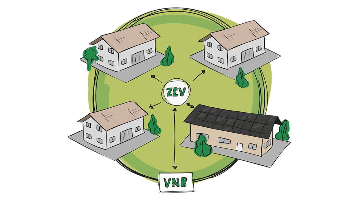 Der Zusammenschluss zum Eigenverbrauch (ZEV) ermöglicht es Besitzern von Zweck- und Wohnbauten seit dem 1. Januar 2018, ihren selbst produzierten Sonnenstrom – auch über benachbarte Grundstücke hinweg – Bewohnern und Nutzern zum Eigenverbrauch zur Verfügung zu stellen. Seit dem 1. April 2019 ist ein ZEV-Verbund neu auch über Strassen, Eisenbahntrassees oder Fliessgewässer hinweg möglich, sofern die Grundeigentümer zustimmen.