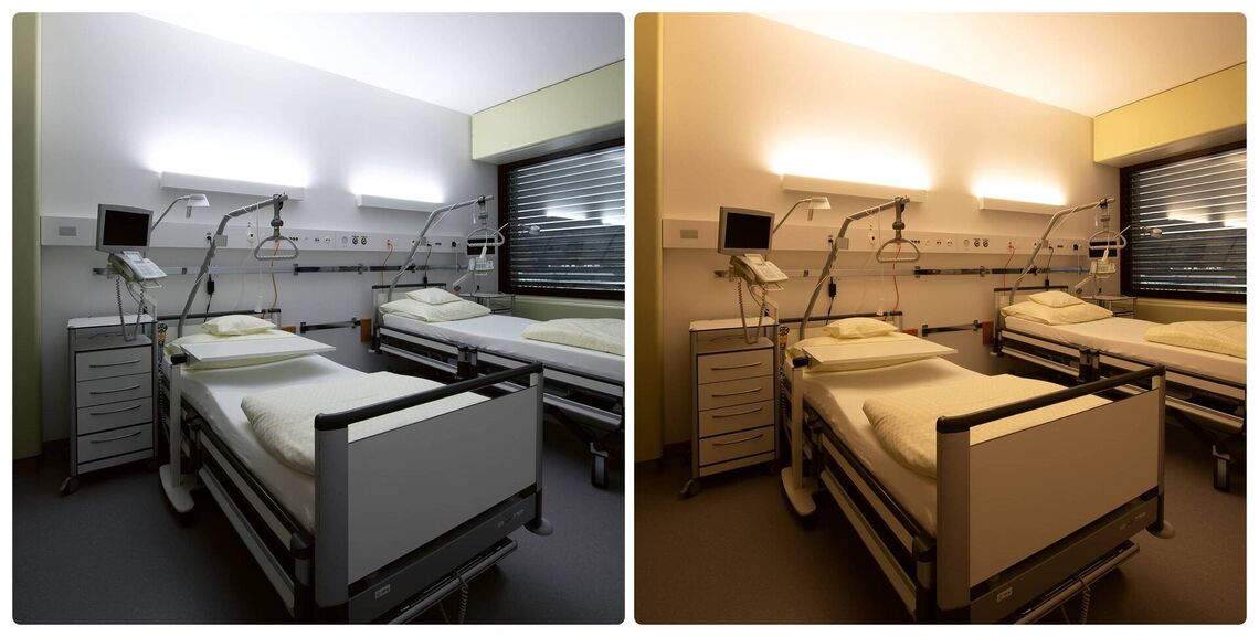 Zusammen mit der KNX-Steuerung bieten die beiden Leuchten beim Bett nun ein Farbspektrum zwischen 2700 und 6500 Kelvin. Am Morgen nach Sonnenaufgang sendet der Farbtemperatur-Master je nach Jahreszeit bis ca. 9 Uhr eine Farbtemperatur von 2700 Kelvin an die untergeordneten DALI-Gateways. Dies entspricht einem warmen Licht. Bis zum Mittag hin verändert er die Farbtemperatur für die Vorschaltgeräte auf rund 5700 Kelvin. Gegen Abend wird die Farbtemperatur wieder kontinuierlich auf 2700 Kelvin zurückgesteuert, so dass die Patienten am Abend in ihrem Zimmer wieder ein warmes, angenehmes, der Abendstimmung angepasstes Licht antreffen.